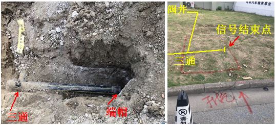 在信號結(jié)束的地方見到了管道的端帽,表明前面再無管道,開挖見到三通,確定了在空調(diào)機下的閥井與管道的連接關(guān)系。