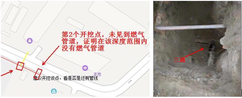 在了解到燃氣公司在2007年前后均無穿越(頂管或者拖拉管)管道施工之后,我們決定在這兩個無信號的位置開挖,證明原圖管道不存在或者是由于聲源信號自然衰減造成的信號消失。