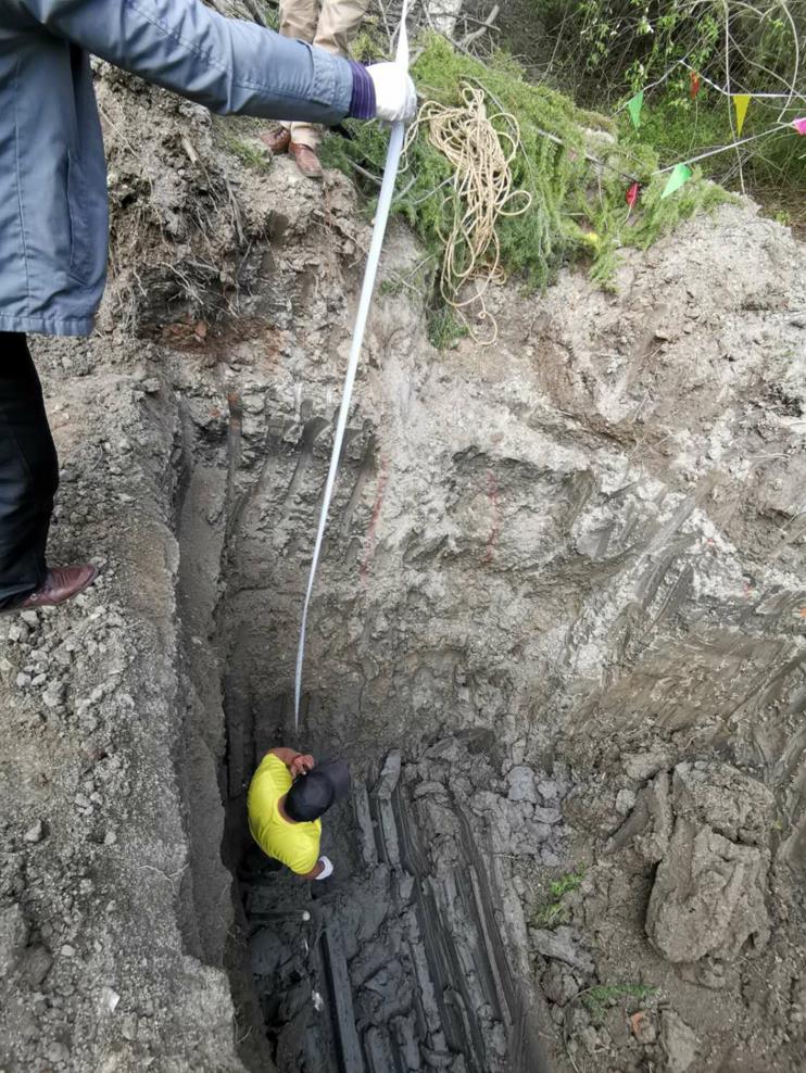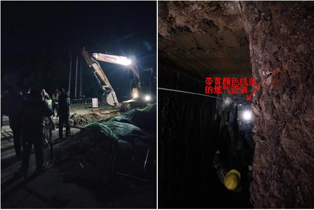 我們探測人員從早上一直在現(xiàn)場探測,直到晚上九點,人工開挖出來見到黃顏色線條的管道,才放心撤離。