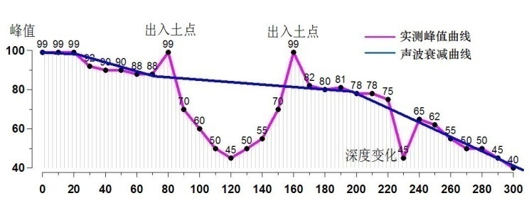 如下圖,假設(shè)閥井內(nèi)信號源位于橫坐標(biāo)0m處,沿橫坐標(biāo)探測距離300m,附近信號峰值距離信號源一定距離后,信號值逐步自然衰減,在管道出入土點位置信號異常強烈,隨后在穿越管段段內(nèi)迅速減弱。